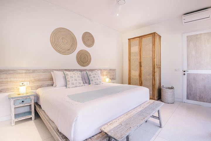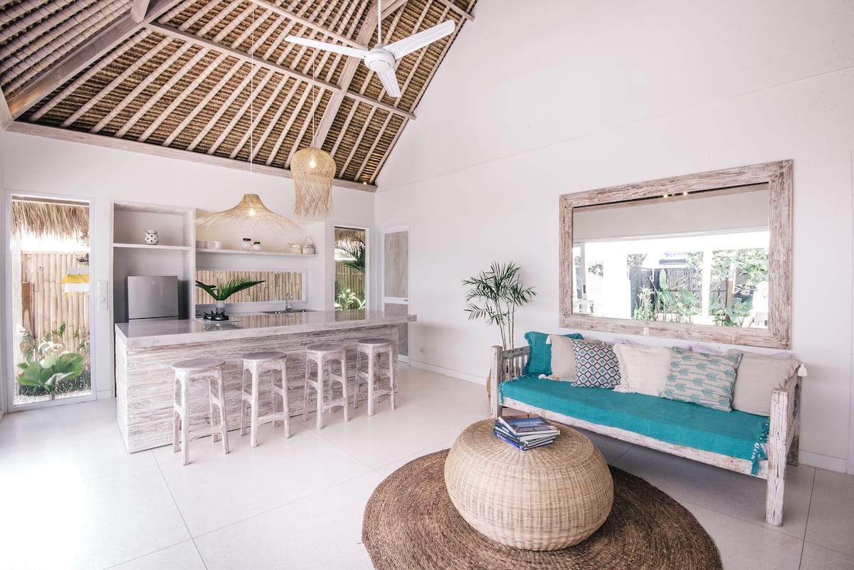 The space has a well-equipped kitchen offering a two burner stove, fridge, kettle, toaster and blender. The villa staff will take care of breakfast for you and your guests – all included in the nightly rate!