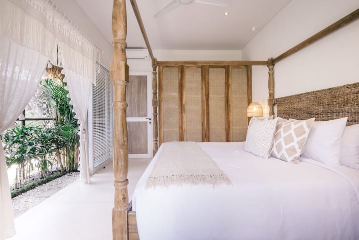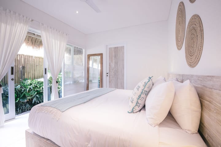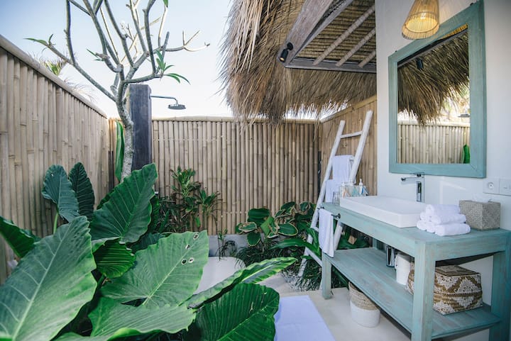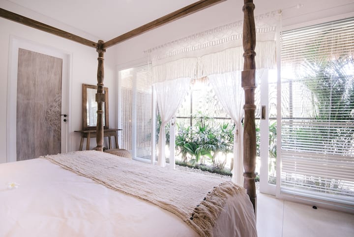 The space: step through the green washed timber doors to lush tropical gardens, an inviting swimming pool and whitewashed bamboo. The timber deck is the perfect spot for alfresco dining at the outdoor table and a generous mattress on a raised platform over the pool will beckon you for that post lunch siesta.